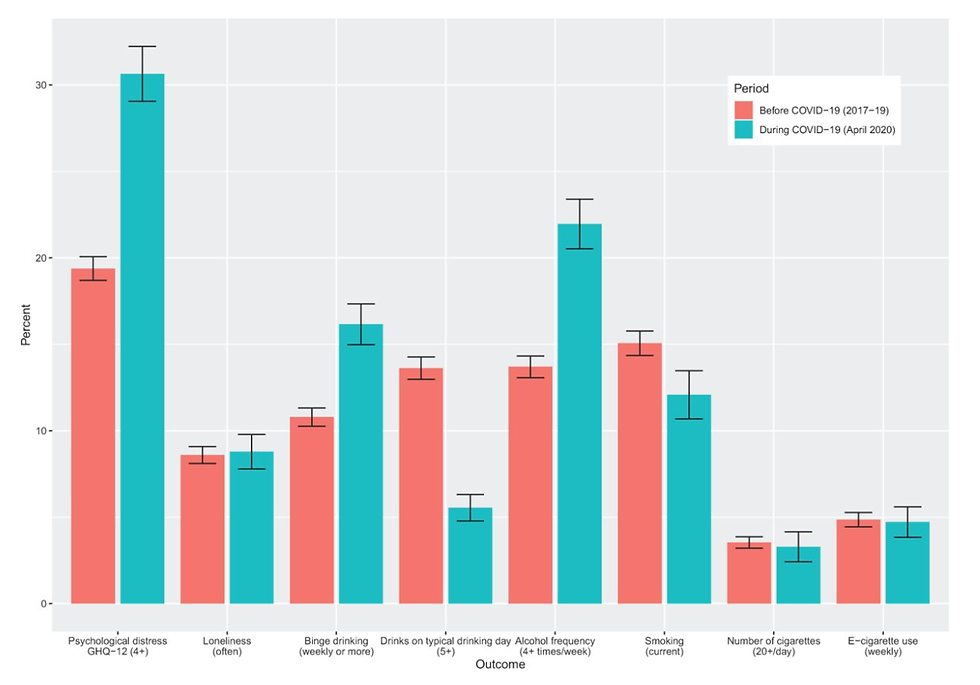 In particular, the rates of psychological distress more than doubled during this tumultuous time, highlighting the severe impact that external stressors can have on individuals' mental well-being. Alongside this alarming increase in distress, there were notable surges in behaviors such as drinking and smoking. Many individuals turned to substances as a coping mechanism to manage their anxiety and the overwhelming uncertainty that characterized the pandemic. This reliance on substances not only reflects a temporary escape but also indicates a deeper, more pervasive issue regarding the mental health landscape during this era.